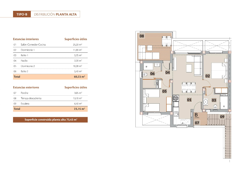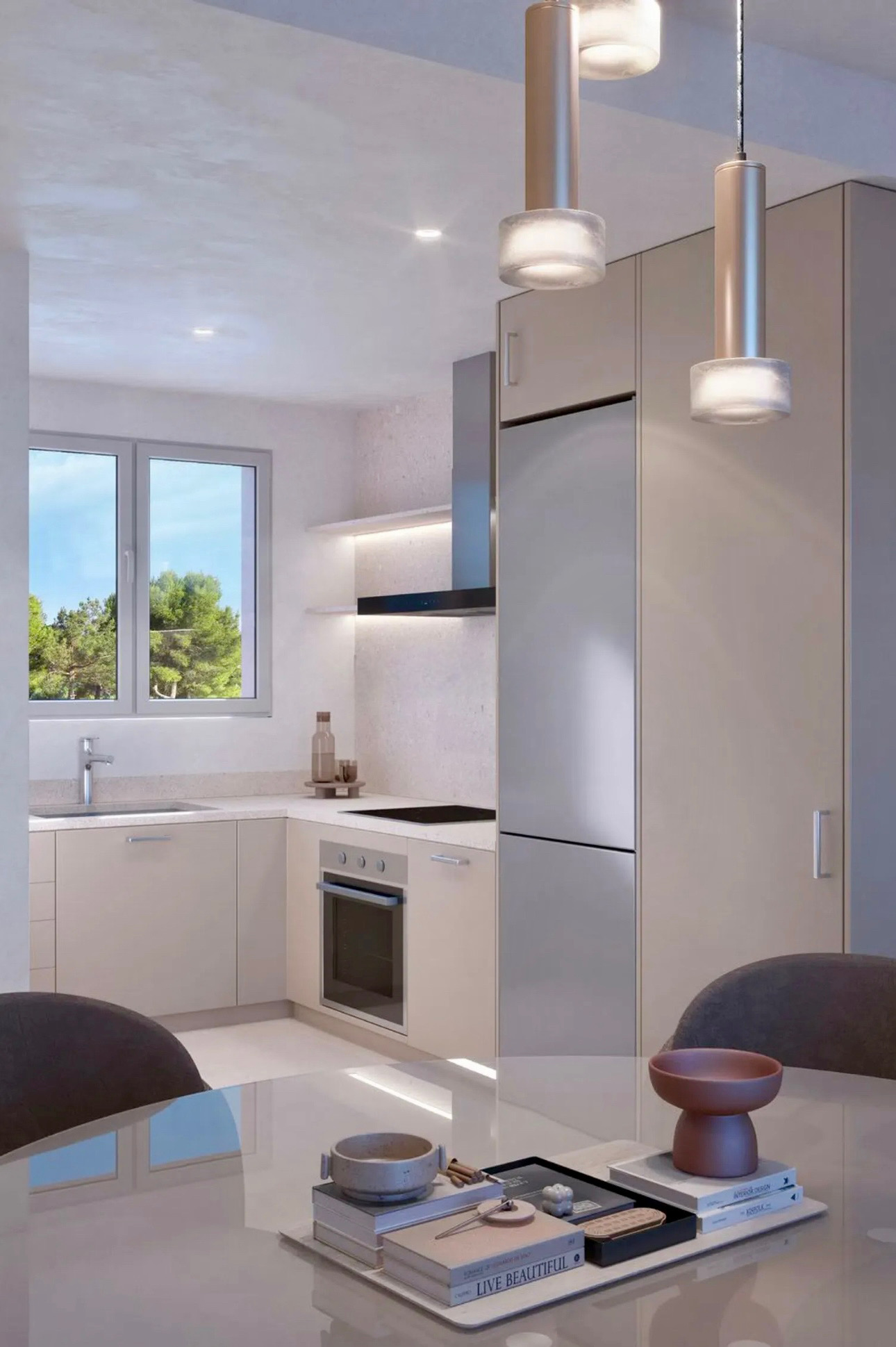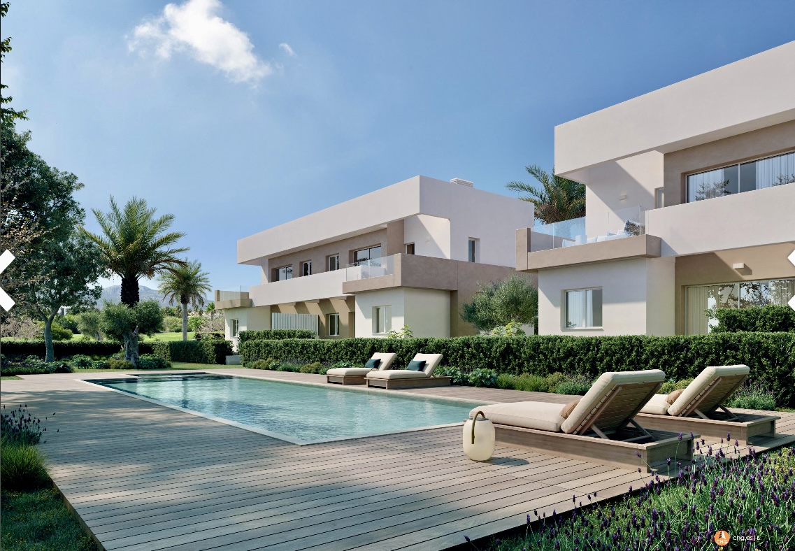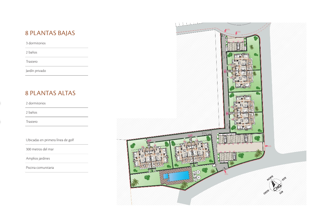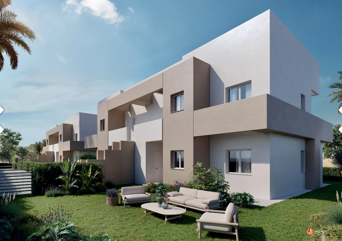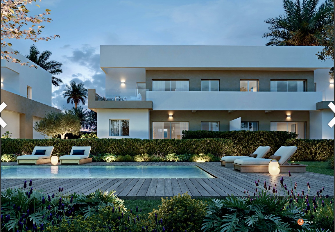 The complex consists of 4 buildings with two floors each. The 8 ground-floor apartments have an open terrace and a private garden, while the 8 upper-floor apartments offer spacious terraces and panoramic views. The residential complex includes a communal pool surrounded by a spacious garden, making it an ideal place to relax in the sun. Additionally, each apartment has an assigned parking space.