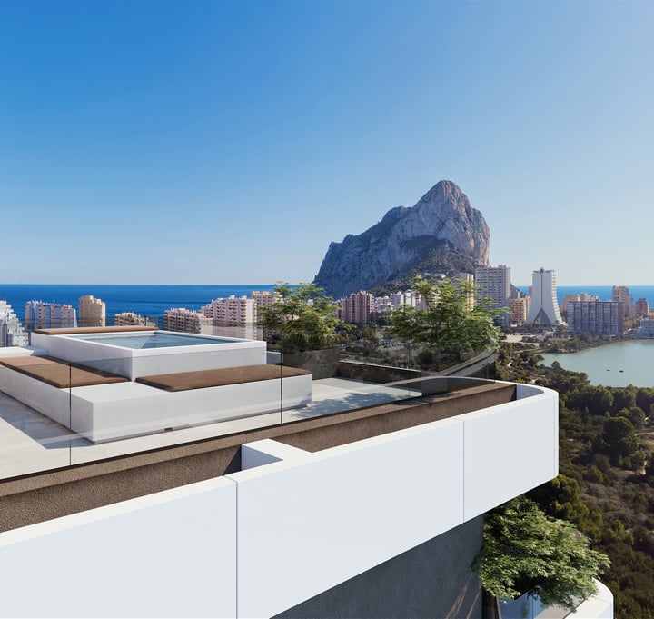 From the 7th floor upwards, every apartment enjoys breathtaking views of the Mediterranean Sea, the Peñón de Ifach, the Las Salinas Natural Park, and the Calpe skyline.