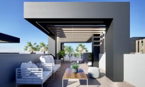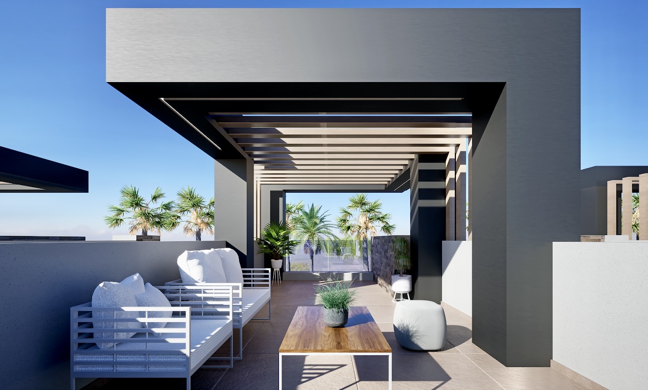 One of the most remarkable features of Villas Saito is that all homes are designed on a single level, blending harmoniously with the natural surroundings. However, their sophisticated and contemporary design is sure to capture attention. A highlight of each villa is the large rooftop solarium, complete with a wood-like pergola—perfect for enjoying long summer evenings or installing a hot tub for moments of relaxation.