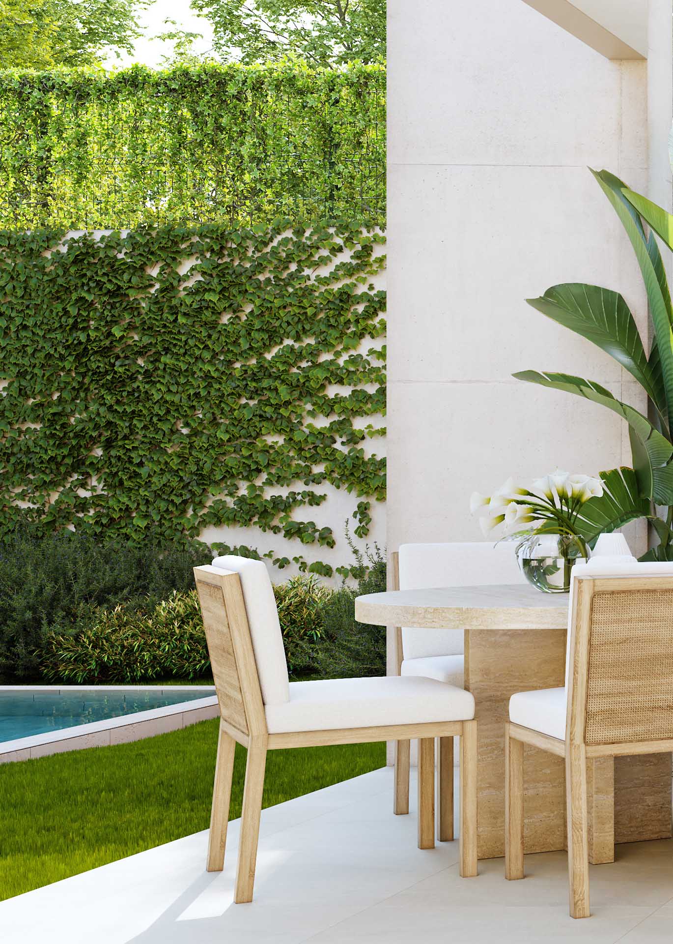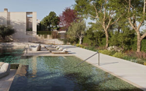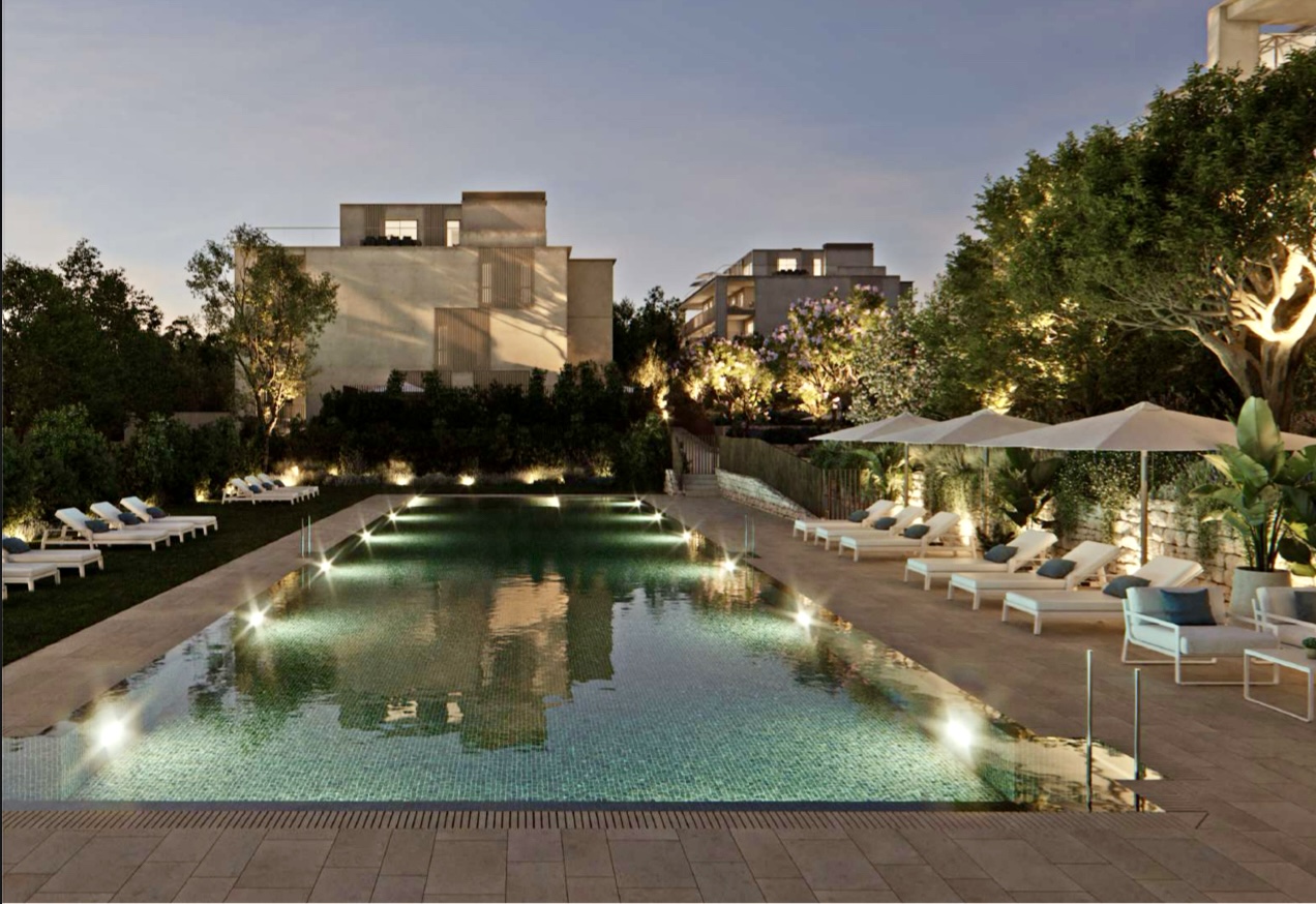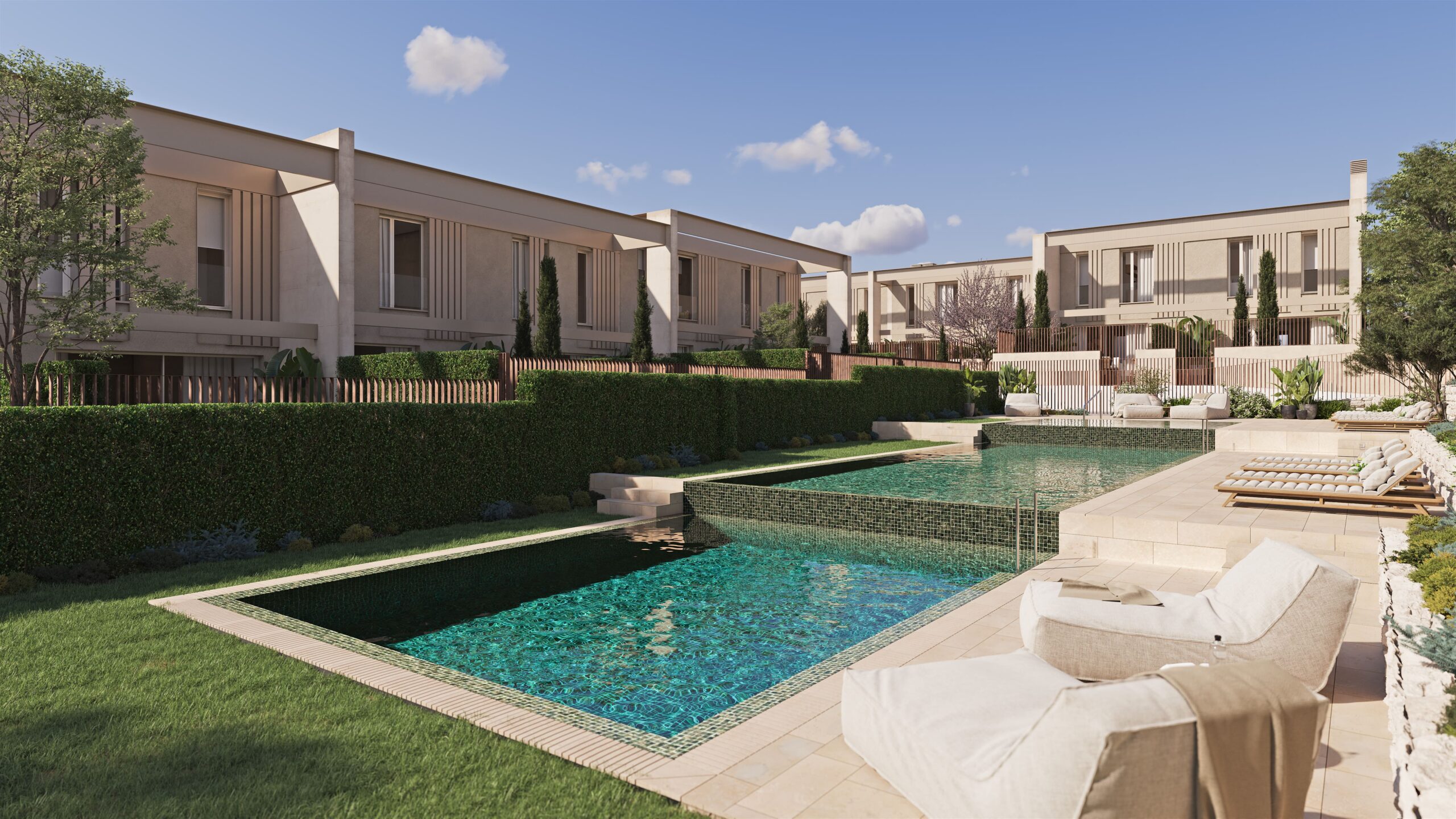 - Stepped communal swimming pool located between the two rows of homes