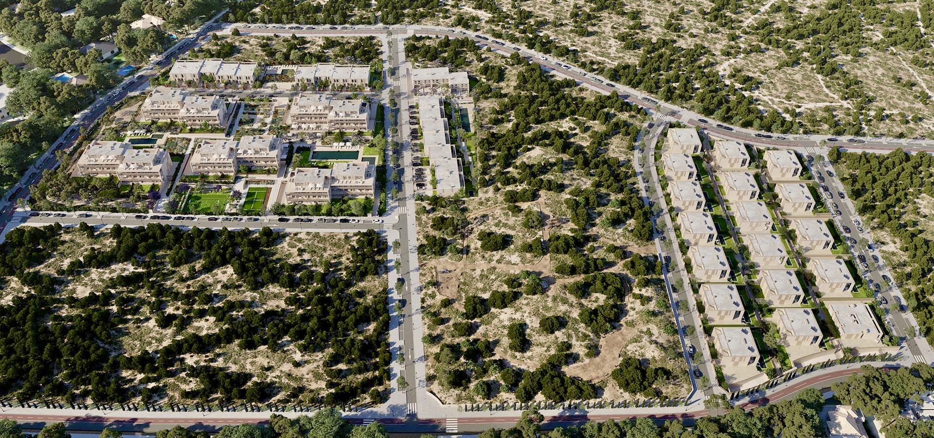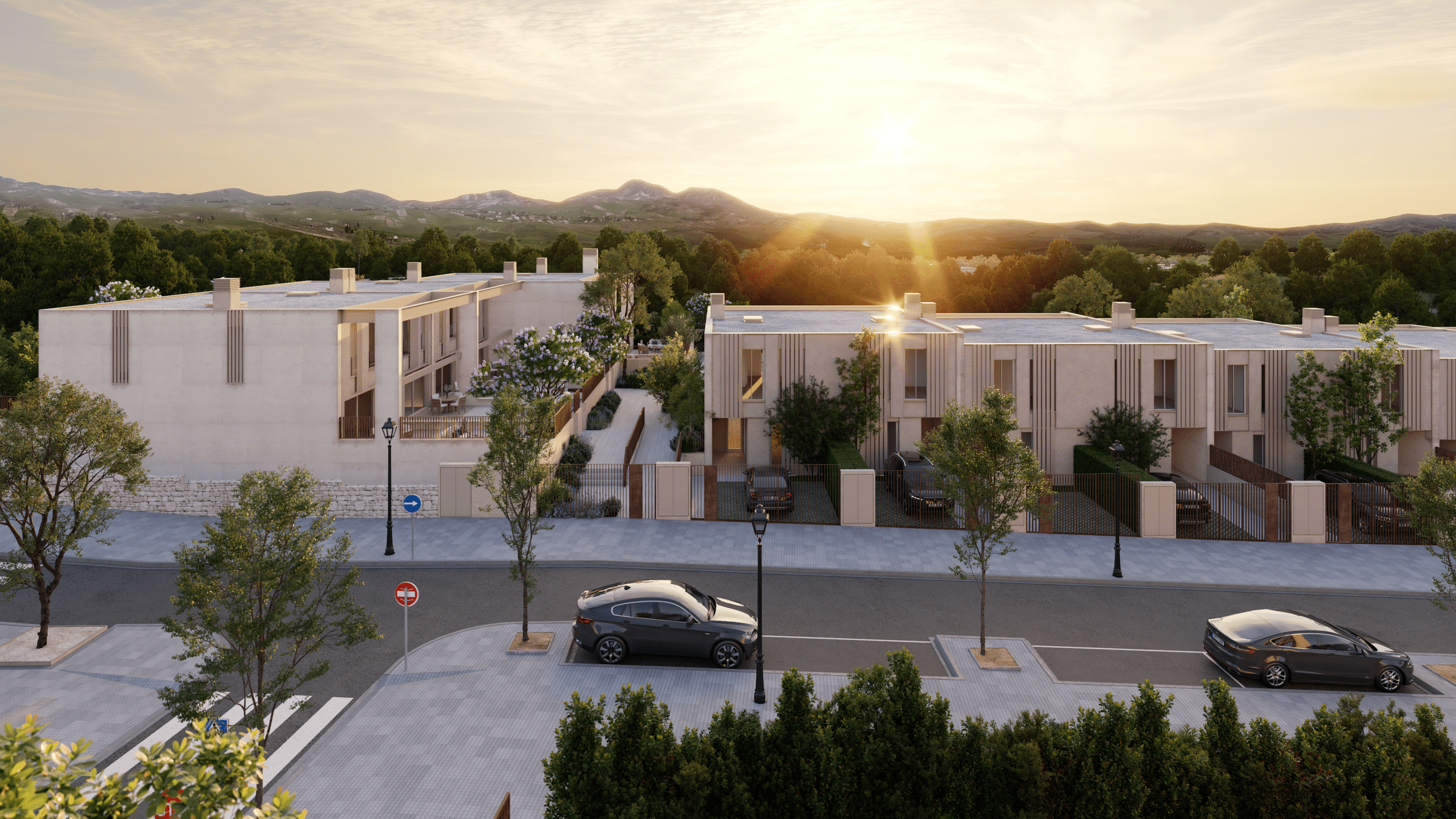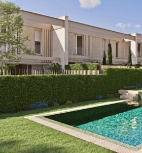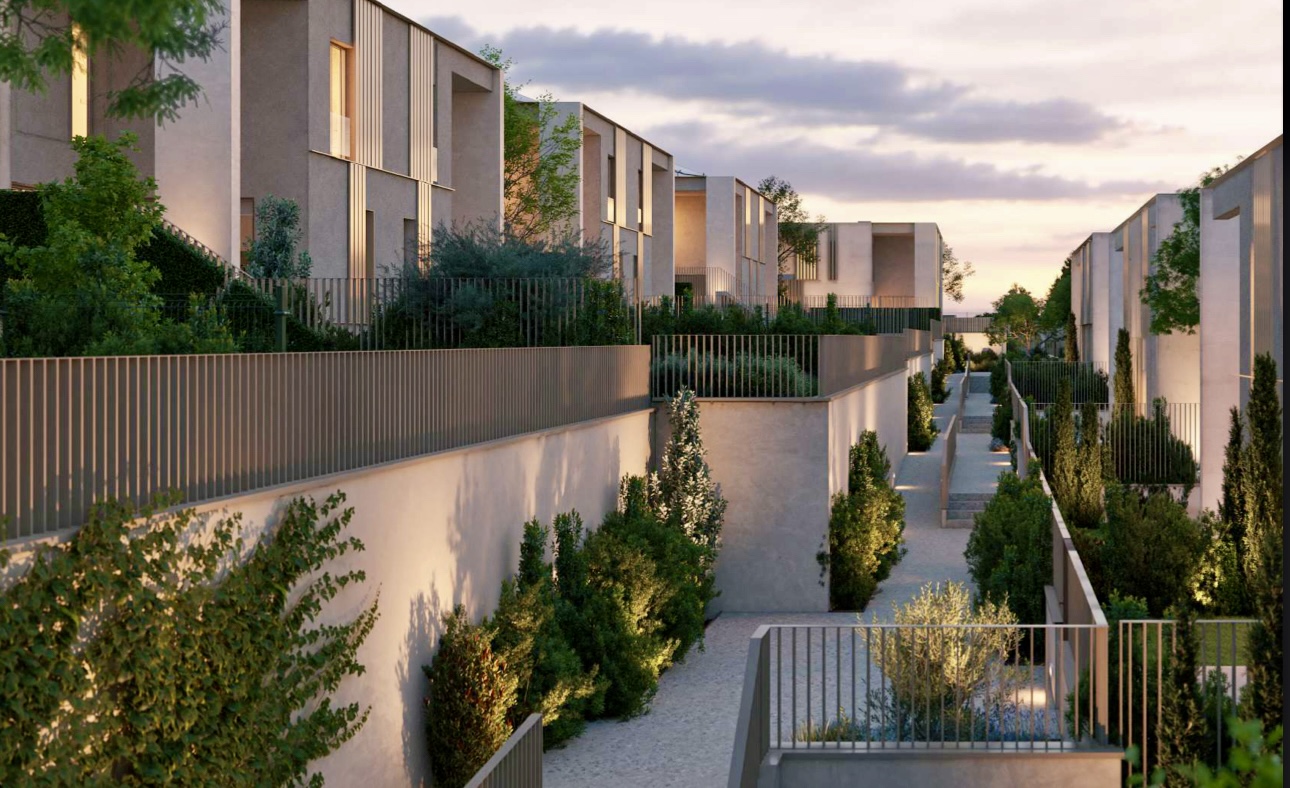 The project consists of 20 modern townhouses arranged in two staggered rows, carefully adapted to the natural slope of the land. Each home enjoys two private gardens at ground level: a front garden providing access to the property and a rear garden connected directly to the main living areas.