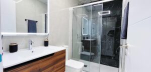 The two bathrooms are finished with high-end ceramic and marble-look tiles, LED-lit mirrors, and walk-in glass showers for a touch of hotel-style comfort.