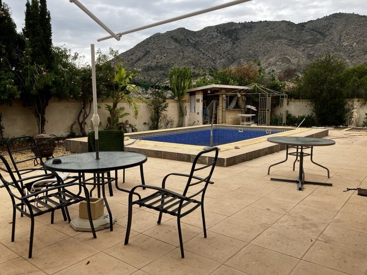 "This large charming villa is composed of four homes in one, three of them with their own access, located in the Bella Orcheta area, this property offers easy access to the town where you can find several restaurants, shops, a medical center and recreational areas for children.The nearest restaurant is just a two-minute walk away. There is a freshwater reservoir for those who like freshwater fishing. The beaches of Villajoyosa and Benidorm are just a ten minute drive away.The chalet in total has 8 bedrooms, 4 full bathrooms, 4 kitchens, 4 living rooms, a terrace on the upper floor and two on the ground floor, closed garage, barbecue area, 8 x 4 pool, automatic plot gates, camera system security and alarm, electricity and drinking water.This chalet would be ideal for vacation rentals and/or for a large family, excellent views of the mountains. With lots of natural light, quiet area, very private plot and completely fenced with walls, if you are looking for a large house to exploit or to share with your family, then you have to see this chalet.