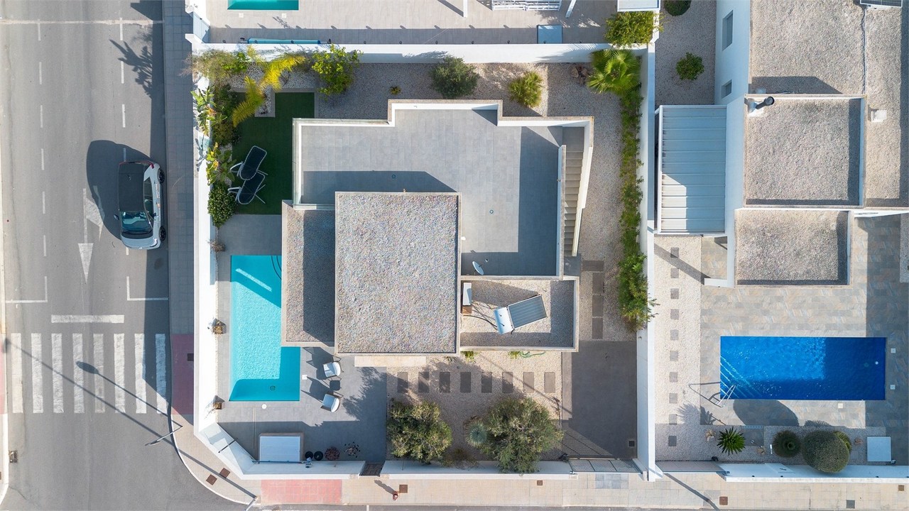 Stunning south facing corner detached villa with 3 bedrooms in Benijofar, Alicante. Within a 5 to 10 minute walk of the town centre or even Benimar where you can find a huge selection of amenities and facilities, and the nearest beaches are only a 10 minute drive away at Guardamar del Segura. The property is furnished and equipped to a very high standard and was built in 2016 by one of the top builders in the area. On entering the property you have an entrance hall with wardrobes giving plenty of storage space, an open plan fully fitted kitchen, a separate utility room, a spacious lounge/dining room with large sliding doors out to the garden, partly covered terrace overlooking the private garden and private swimming pool, three double bedrooms, the master with en suite shower room, all bedrooms come with fully fitted wardrobes and have direct access to terraces or the garden, and a family shower room. The property also boasts full air conditioning and under floor heating in the bathrooms.Outside is a beautifully landscaped garden, low maintenance with tiled, gravelled and artificial grassed areas, irrigation system, off road parking, private swimming pool with large patio areas having plenty of space for seating and sun bathing areas and the added bonus of raised walls to give you the added privacy on your plot.Benijofar is one of the villages that makes up the Vega Baja area on the Costa Blanca. It is a lovely village with a charming church and an attractive square/plaza. In Benijofar there are a lot of places to visit, for instance the Casa de Cultura where concerts and shows take place all year round. There is also a marked walking trail which includes the Rio Segura and an outdoor swimming pool. In Benijofar you can also find a walking and cycling route and the three crosses viewpoint. If you are a nature lover, you must visit the Cañada Marsa Park and El Secano Park. These two places are located in the commercial area of Benijofar, called Benimar.