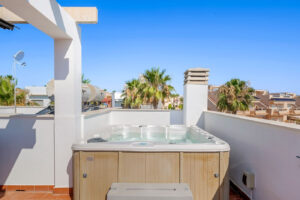 Welcome to this beautiful penthouse apartment, situated in a gated and well-maintained complex in the heart of Punta Prima – one of the most sought-after areas of Torrevieja.Built in 2012, the apartment offers a modern design with clean lines, large windows, and attractive outdoor spaces. It features two bedrooms and two bathrooms – both with walk-in showers and elegant finishes. The spacious primary bedroom includes an en-suite bathroom, and both bedrooms come with built-in wardrobes. The kitchen and living room are located at opposite ends of the apartment, providing great room division and a functional layout.From the living room, you step out onto a cozy terrace overlooking the green park area across the street – a perfect spot to enjoy a quiet morning coffee.Next to the kitchen, you’ll find a second small terrace with views of the communal area. From here, a staircase leads up to the highlight of the home: a fantastic private rooftop terrace. This sunny space features a jacuzzi and plenty of room for an outdoor dining area, lounge furniture, and sunbeds. A pergola offers both shade and sunshine – the perfect place to relax all year round while taking in the views of the surrounding area and rooftops.The apartment is equipped with ducted air conditioning for both cooling and heating, ensuring comfort in every season. It is sold fully furnished and ready to move into. A dedicated parking space in the communial area is also included.The gated complex offers excellent amenities, including a heated communal pool, a children&039;s pool, and a sauna – ideal for both relaxation and social gatherings.The location is truly hard to beat: peaceful surroundings, yet within walking distance of everything you need. Punta Prima’s wide selection of cafés, restaurants, and bars is just a few minutes away, and the Consum supermarket as well as a new commercial center under construction are conveniently located just behind the existing shopping area. The sea and sandy beaches are also within easy reach, and for those who enjoy staying active, there is a newly built indoor padel court nearby.You are also just a short drive from several renowned golf courses such as Villamartin, Las Ramblas and Campoamor – all within 10 to 15 minutes – and only about 7 minutes from the popular Zenia Boulevard shopping mall. Alicante Airport is approximately 45 minutes away.This property combines modern comfort with a prime location – ideal as a holiday home, year-round residence, or rental investment. Here, you’ll enjoy sunshine, tranquility, vibrant local life, and top-notch facilities – all in one placeThis property combines modern comfort with a prime location – ideal as a holiday home, year-round residence, or rental investment. Here, you’ll enjoy sunshine, tranquility, vibrant local life, and top-notch facilities – all in one place.Book a viewing today if this apartment feels just right for you.