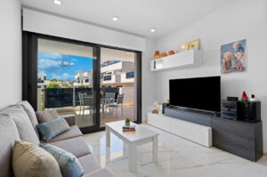 This modern luxury second floor corner apartment with 2 bedrooms and large private terrace is situated in the very sought after area of Villamartin, Alicante (Orihuela Costa)The property will be sold fully furnished and consists of a spacious lounge/dining room area, a modern open plan fully equipped kitchen, two bedrooms with fitted wardrobes, two bathrooms (one is en-suite), patio doors from the lounge also lead out onto a private terrace to enjoy the Spanish sun all day. Parking space and storage room in the underground garage is included in the price as well.All residents of this development have use of the indoor gym and the Spa&Wellness area, a very beautiful landscaped communal garden with swimming pool and jacuzzi, children’s playground.Set in a great location with stunning views, you are only a few minutes walk away from the famous Villamartin Plaza with local restaurants, bars and shops to cater for all tastes and needs. The fantastic sandy beach of La Zenia is only a 10 minute drive away.