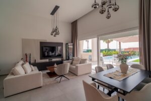 We present this stunning luxury villa located in the prestigious La Finca Resort, an exclusive enclave on the Southern Costa Blanca, surrounded by nature, peace, and a renowned golf course. Situated within the new Mar Egeo Residential, this property blends contemporary design, comfort, and energy efficiency in a privileged setting with over 300 days of sunshine per year. Distributed on a single floor plus a bright and spacious basement thanks to its English patio-style light wells, the home features 3 bedrooms with built-in wardrobes, including an elegant master suite with a walk-in closet and private bathroom, as well as another en-suite bedroom. It offers 2 full bathrooms and a guest toilet, all finished to a high standard, with underfloor heating, tempered glass shower screens, and modern mirrors. The open-concept kitchen stands out for its modern style, high-quality materials, and ample storage. Fully equipped with state-of-the-art appliances, it connects via a breakfast bar to the spacious living-dining area with views of the pool, creating a warm and functional atmosphere. From the double-height living room, you have direct access to the private garden, where you can fully enjoy the Mediterranean climate on the large terrace with a built-in pergola, relaxation area, and a private pool — perfect for unwinding. The villa is sold fully furnished and equipped, featuring high-quality furniture and decorated down to the finest detail — ready to move in and enjoy from day one. It also includes numerous extras, such as: •Central heating and air conditioning throughout the property •Smart home system for climate control, blinds, and lighting •Solar panels for a more efficient and eco-friendly home •Pre-installed outdoor barbecue area, with water outlets and lighting points •Closed garage with capacity for 2 vehicles, with direct access to the home This property is perfect as a main residence or as an investment in one of the most sought-after areas in the south of Alicante. A unique opportunity in an unbeatable location!
