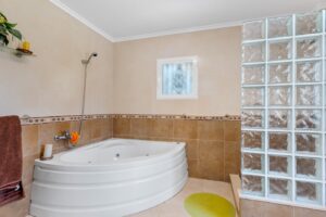 Laid on two floors ,On the ground floor there are 4 bedrooms, 3 bathrooms, dining room ,good size kitchen and storage room . Upstairs there is a huge living space with different sitting areas and a bar , with beautiful high ceilings. From here there is access to the solarium and stairs to the outside pool and garden . On the plot , there is huge outdoor area with beautiful covered terrace, large gardens, solarium and private pool .