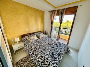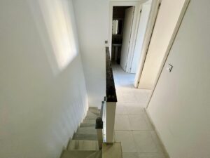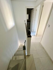 The house is located on the ground floor where you are first met by a cozy terrace to the north with good space for e. g. outdoor furniture.Once inside, you are greeted by an open plan between a living room with space for a dining table and a fully equipped kitchen with plenty of storage. On this floor there is also access to a storage room where a washing machine and water heater have been placed. There is also a full bathroom with shower.One floor up we encounter two spacious bedrooms, one of which boasts a built-in wardrobe and a complete bathroom with bathtub.From both bedrooms you have access to a cozy balcony with a view of the street.Belonging to the residential area, there is a pleasant and appreciated communal pool area.