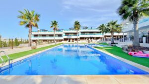 This three-bedroom, three-bathroom duplex townhouse is located in the exclusive residential area of Los Balcones in Torrevieja. The property stands out for its modern design, bright interiors and spacious terraces that allow you to enjoy the Mediterranean lifestyle all year round.On the ground floor, the house features a private 22 m² garden with space for outdoor dining. Inside, there is an open-plan living room with an elegant feature wall, connected to a fully equipped modern kitchen with appliances and breakfast bar. This level also includes a bedroom with fitted wardrobes, currently adapted as a study, and a complete bathroom with shower.Upstairs, there are two further bedrooms, both with fitted wardrobes. The master bedroom is particularly bright and has direct access to a private terrace with views of the residential area and the swimming pool. This floor also offers two additional bathrooms with modern finishes.The property also benefits from a large private solarium with open views of the Torrevieja lagoon, equipped with a chill-out area, pergola, barbecue and sun loungers — perfect for outdoor gatherings or simply relaxing in a peaceful setting.The residential complex offers large communal areas with a swimming pool surrounded by palm trees and green spaces, creating an ideal environment for families or those seeking a relaxed lifestyle.Los Balcones is one of the most established residential areas of Torrevieja, with all services nearby: supermarkets, schools, pharmacies, sports facilities and Torrevieja University Hospital. The beaches of Punta Prima and Torrevieja are less than 4 km away, making this property an excellent choice both as a permanent residence or a holiday investment.