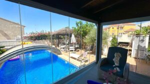 Detached Corner Villa with Private Pool and Solarium – Just 1 km from the Sea We present this magnificent property located in an exclusive residential development just one kilometer from the coast. This detached corner villa offers privacy, comfort, and an excellent quality of life, both as a primary residence and as a second home near the sea. Layout and Outdoor Spaces With a 200 m² plot and 119 m² built area, this home is spread over three floors, maximizing space and functionality. The property has vehicle access and parking within the plot, as well as its own private pool, all surrounded by a well-maintained garden and terraced areas ideal for enjoying the outdoors. Furthermore, it is part of a development that also offers a communal pool, providing more leisure options without leaving the surrounding area. First Floor: Common Areas and Amenities Upon entering the home, we are welcomed by a glass-fronted hall that provides light and spaciousness from the first moment. On this floor, you'll find a modern full bathroom, a contemporary kitchen fully equipped with quality appliances, an additional pantry, and a spacious and bright living and dining room. From the living room, you can access a glazed terrace with direct views of the private pool and garden, creating a perfect setting for family gatherings or relaxing moments. Second Floor: Lounge Area Upstairs, you'll find three double bedrooms, all with built-in wardrobes. The master bedroom has its own en-suite bathroom, ensuring privacy and comfort. There's also a second full bathroom serving the other bedrooms. Third Floor: Solarium and Storage Room The third floor houses a practical storage room and a large private solarium, ideal for sunbathing, a chill-out area, or even a small urban garden. From here, you can enjoy unobstructed views and a peaceful setting. Extras and Energy Efficiency The home is equipped with air conditioning in all rooms to ensure maximum comfort year-round. In addition, it has solar panels already installed, which contributes to more efficient energy consumption, significantly reducing electricity costs and promoting a more sustainable lifestyle. Features at a glance: Detached corner villa 200 m² plot 119 m² built area Private and communal pool 3 floors 3 bedrooms with built-in wardrobes 3 bathrooms (1 en suite) Independent, fully equipped kitchen Living/dining room + glazed terrace Storage room and private solarium Air conditioning in all rooms Solar panels for self-consumption Parking within the plot Only 1 km from the sea A perfect home for those seeking space, privacy, and a peaceful setting with all amenities nearby and the sea just minutes away. Would you like to schedule a viewing or receive more information? We are at your disposal.