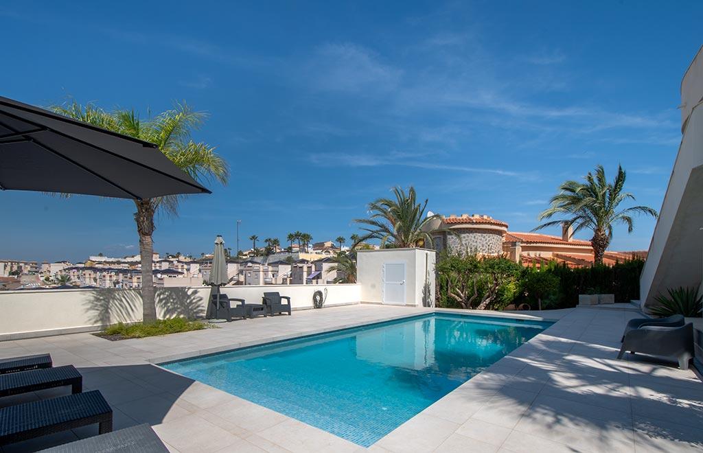 Fabulous ready-to-move-in villa in Ciudad Quesada. The villa is built on an elevated plot ensuring magnificent panoramic views. The villa is close to various commercial areas, with a wide choice of bars and restaurants, as well as the 18-hole La Marquesa Golf Course, as well as all the daily services available in the neighbouring towns of Benijofar and Rojales. The fantastic Guardamar beach is only 15 minutes away by car, and Alicante airport is less than 45 minutes away.Impressive villa with 4 bedrooms and 3 bathrooms, plus a spacious solarium and a basement. The main living area combines the lounge and dining area, with a double high ceiling, allowing a lot of natural light in. The large windows in the lounge lead to a spacious terrace, with incredible panoramic views. This terrace overlooks the pool and is ideal for enjoying a get-together with family and friends, with space for an extra lounge and dining area. The semi-separate kitchen includes white goods. There are 3 bedrooms and 2 bathrooms (1 en-suite) as well as the master bedroom with en-suite bathroom and access to a terrace. The basement is a multipurpose space that can be used for any necessity, like home gym, extra lounge, home cinema, or any other requirement. The solarium has both covered and uncovered spaces, where the more than 320 days of sunshine can be enjoyed all year ‘round, as well as panoramic sea views. The plot also includes an open parking area, with space for several cars.The villa includes ducted A/C, underfloor heating through the villa, white goods, fitted wardrobes, alarm, storage room, a private 5x8 pool with outdoor shower, and parking on the premises.