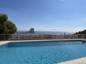 Large semi-detached house of 274 m2 with the best views over Calpe is now offered for sale in an exclusive gated area. Upon entering the property, you are greeted with a breathtaking sight. From the parking area, there is a panoramic view over the entire plot, the sea, and the Peñón de Ifach, which at 332 meters high dominates the horizon. The property is situated 150 meters above sea level and is the last house in a natural area on Mount Olta. The area is protected, and no construction is allowed in front or behind. This extraordinary property allows you to enjoy your stay in Spain. Direct access to the pool from the terrace via a separate entrance. Multiple terraces around the property are perfect for enjoying the spectacular views and outdoor dining. There is ample parking just outside the entrance. The property also offers a large storage room. The house is spread over 2 floors. Upon entry, you are welcomed by the spacious living area with access to terraces and the fantastic sea views. The large living area features a fireplace. There are terraces around the property with access from multiple rooms. Built- in 1990, the property boasts 5 bedrooms. The plot covers 4965 m2 and is fenced off with gates. Area: Located in the beautiful Oltamar-Cucarres-Gargasindi area of Calpe, this property offers a peaceful and almost picturesque stay. The nearest beach is Playa Arenal-Bol, just 2.8 km away, providing excellent opportunities to enjoy the sun, sand, and sea on the Costa Blanca. In summary, this is a fantastic 5-bedroom semi-detached house of 274 m2 in Oltamar-Cucarres-Gargasindi. With its breathtaking sea and mountain views, luxurious features, and spacious living areas, it truly is the perfect property for those seeking a unique and exceptional living experience in Calpe. It is also possible to purchase a share of the house if you wish to acquire 50% of the property. Do not miss this unique opportunity to own a piece of paradise.