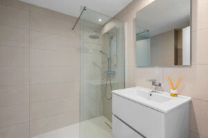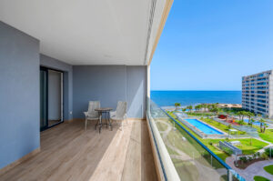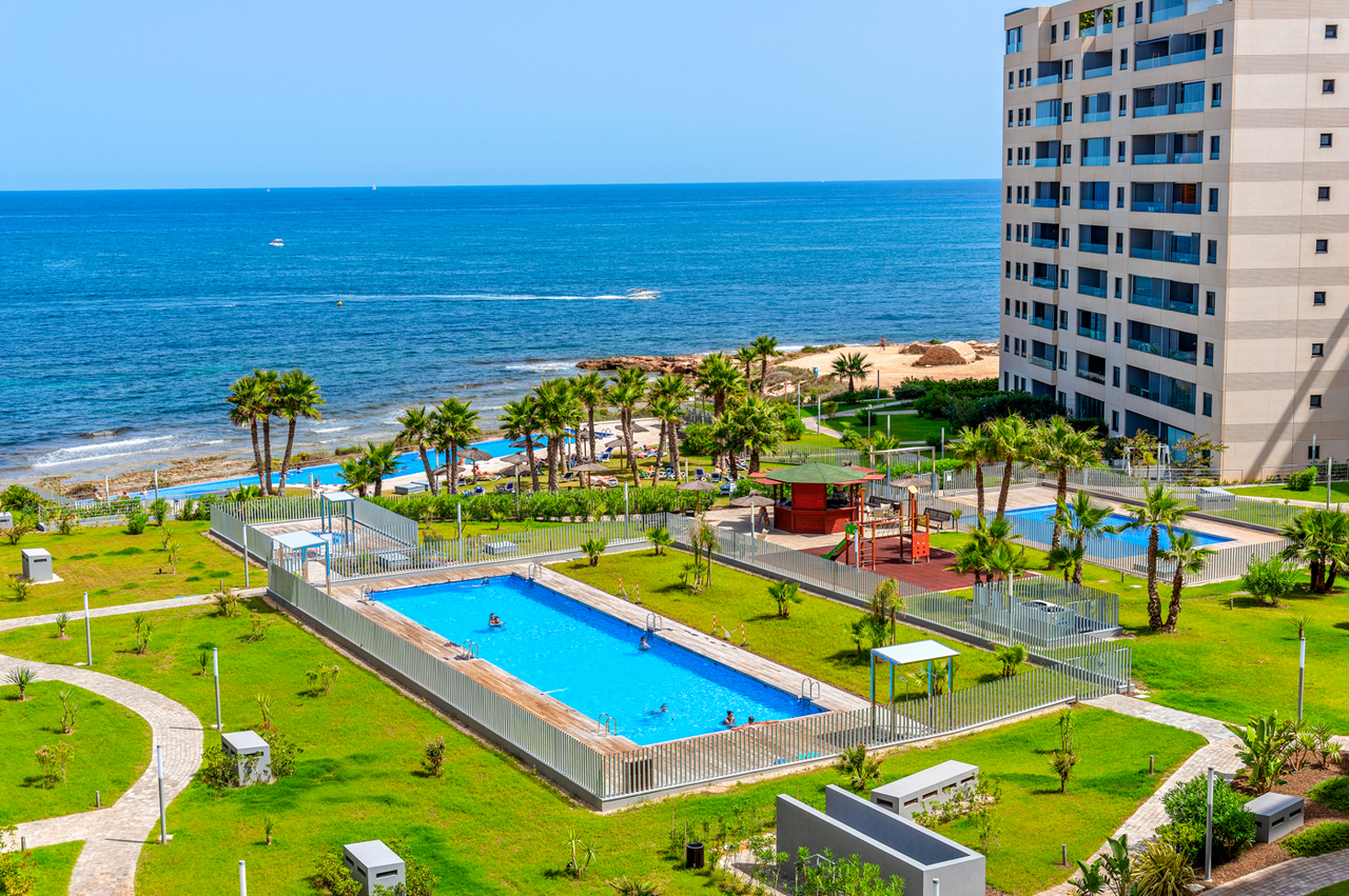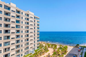 Fantastic exclusive frontline luxury apartment with 2 bedrooms, on the 5th floor, with sea views situated in the popular area of Punta Prima, Alicante.This very modern designed project is set in a very unique location, with large communal garden areas and its unbeatable sea views! The apartment will be sold fully furnished and consist of a spacious and bright living/dining room, a modern fully equipped kitchen, two bedrooms with fitted wardrobes, two bathrooms with underfloor heating, intercom system, air conditioning (hot/cold) throughout the property, an allocated underground parking space and storage room.There is a lovely communal garden with several swimming pools, a heated swimming pool, children’s pool, infinity pool and jacuzzi.
