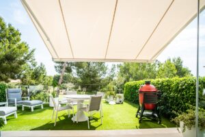 Living area & plot The apartment has a living area of 77 m², has a spacious covered terrace (together 92 m²) and a total plot size of 149 m². The house was built in 2022 and was purchased new in 2023. ✨ Finishing & extras The house is ready to move into and finished with high-quality materials and many additional options: • Front and back garden completely landscaped with low-maintenance artificial grass • The veranda was completely closed off with a stylish 4-metre wide glass curtain and additional windows in the upper openings. • The backyard has a 4-meter electric awning for the necessary shade and comfort. ️ Layout • 2 bedrooms with spacious fitted wardrobes (1 with 3 doors, 1 with 4 doors) • 2 bathrooms, both equipped with modern showers with sliding glass doors • Modern open kitchen equipped with: • Large refrigerator • Built-in dishwasher • Hob and oven • 2 extra storage cupboards provided in the kitchen. • Black glass splashback instead of traditional tiles