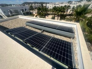 The apartment consists of an open plan living space with kitchen, 2 double bedrooms , 2 bathrooms (master en suite) , west facing terrace overlooking the landscaped gardens and a sun drenched solarium with awnings and built in storage .