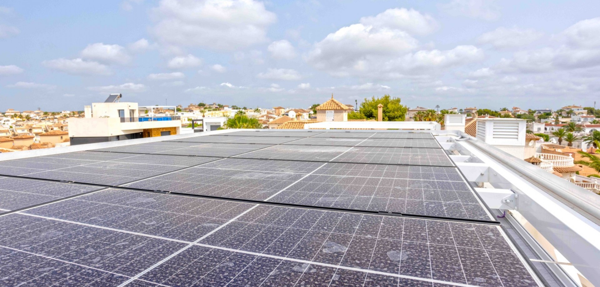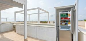 Luxury meets sustainability on the rooftop terrace, equipped with an outdoor kitchen, a spacious pergola with horizontal and vertical parasols, and 4100-watt solar panels to meet your energy needs. Additional features like a washing machine and fridge-freezer are discreetly housed on the terrace for ultimate convenience.