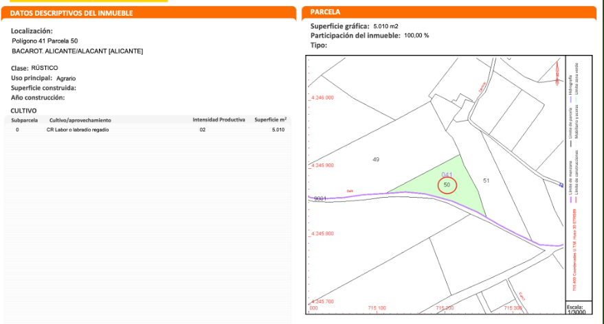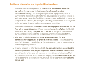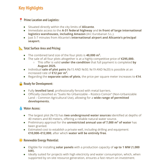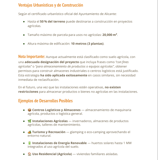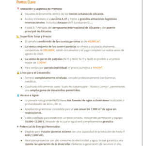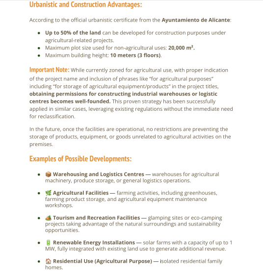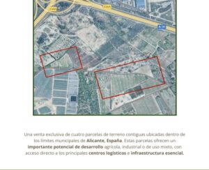 Unique Opportunity in AlicanteDiscover an unparalleled space in the beautiful city of Alicante, in the province of Alicante. This vast 40,000 m² plot offers a blank canvas for those looking to create their own sanctuary in a privileged natural setting. With a south-facing orientation that ensures warmth from the sun all day long, this property promises to be a volcano of possibilities.Space and PotentialImagine the potential to develop a residential project or even an exceptional agricultural investment. The size of the plot allows for remarkable flexibility in the use of space, from creating a personal garden to establishing a small tourist complex. With such land, your dreams can come to life, whether you wish to build your dream home or a real estate project in a high-growth area.Strategic LocationAlicante is famous for its warm climate, golden beaches, and vibrant cultural life, all just a few minutes from this unique location. The proximity to the city allows easy access to a variety of services, from schools and supermarkets to restaurants and recreational areas, without giving up the tranquility that the plot offers.Property Details Plot size: 40,000 m² Orientation: South Project status: In progressWith an ongoing energy certification status, the property is at a stage where its potential can be further defined. This adds significant value, as spaces can be designed to optimize energy efficiency and contribute to a more sustainable lifestyle.A Bright FutureInvesting in this plot is much more than a simple purchase; it is an opportunity to establish roots in one of the most charming places on the Mediterranean coast. Whether you are looking for a project to get involved in or simply a place where you would like to spend unforgettable moments, this plot in Alicante awaits you to fulfill your visions.Don't miss the chance to be part of this exceptional environment. The life you have always dreamed of could be just a step away from becoming a reality here, in this dream plot.