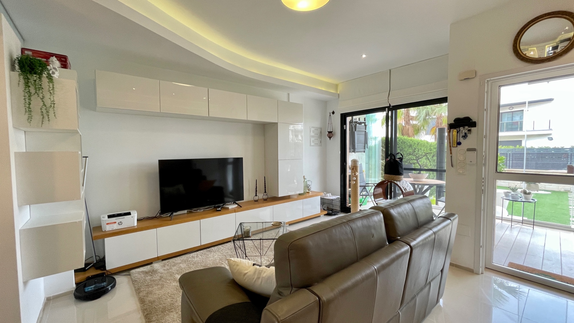 The house features a spacious and sunny terrace with glass curtains , allowing you to enjoy the outdoors year-round. The modern open-plan kitchen and bright living room create a pleasant atmosphere, while the air conditioning and alarm system contribute to comfort and security.
