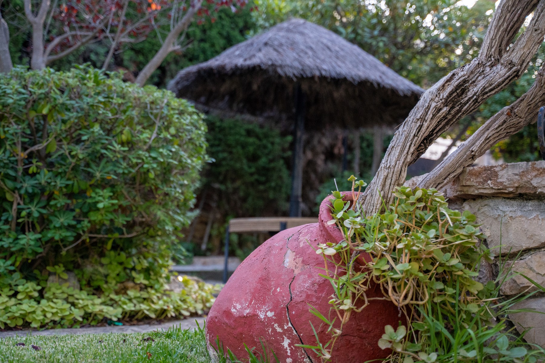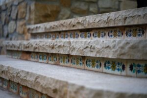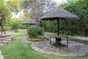 The villa stands out for its elegant cobblestone façade, which gives it a timeless and sophisticated style, making it harmoniously integrated with the manicured gardens that surround it.