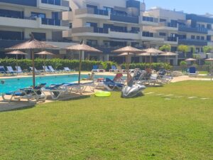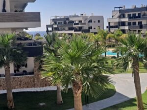 Welcome to a home that perfectly combines modern design, comfort, and breathtaking sea views. Located in the exclusive Amanecer Deluxe residential complex, this elegant apartment is situated on the first floor of a building with only three levels, in the heart of Orihuela Costa, just a few steps from the Mediterranean Sea and surrounded by all essential services. With a total surface area of 98.37 m², the property offers open spaces and a functional layout. It features two bright bedrooms, two bathrooms —one of them en-suite—, a fully equipped open-plan kitchen, and a spacious living-dining room, ideal for enjoying quality time with family and friends. A wrap-around terrace runs along the entire length of the apartment, providing abundant natural light and the perfect setting for unforgettable outdoor moments. This apartment is sold fully furnished and equipped with high-end materials, including PVC double-glazed windows with electric shutters, underfloor heating in the bathrooms, air conditioning, and modern, elegant finishes. It also features built-in wardrobes in all bedrooms, a large storage room, and a private parking space, offering plenty of comfort and convenience for the whole family. The Amanecer Deluxe complex boasts exceptional communal areas, including a communal swimming pool surrounded by landscaped gardens with sea views, a barbecue area perfect for social gatherings, a children’s playground, and access to serene fountains and green spaces. The residence is a secure gated community with 24/7 security, ensuring peace and privacy throughout the year. You will also enjoy a fully equipped gym and sauna, ideal for those seeking an active and healthy lifestyle. Thanks to its privileged location, close to supermarkets, pharmacies, cafés, restaurants, and bars, and just a few minutes’ walk from the beach and the popular La Zenia Boulevard shopping center, this property is a perfect choice, whether you’re looking for a main residence, a holiday rental investment, or a sunny retreat. Its proximity to the area’s best golf courses and the lively Saturday market makes this an exceptional opportunity.