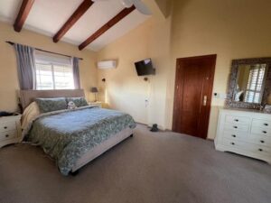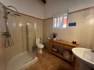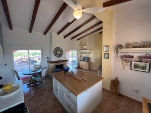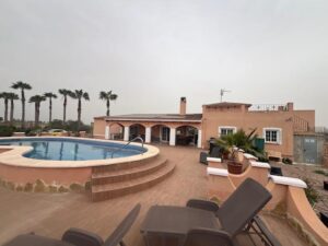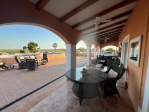 Stunning country house in Dolores, ALICANTE with 3 double bedrooms, 2 bathrooms, 2 walk-in wardrobes, lounge/diner with fireplace open kitchen, separate preparation kitchen, study andsecond lounge with access to decking area to the garden. The villa is on a fenced plot of 6,300m with a 10 x 5m pool with large terrace surround. Ideally situated in a peaceful rural setting although close to town and only 15 mins’ drive to beaches and 35 mins to the airport of Alicante/Elche. Enjoy the superb views from the rooftop sun terrace. Mains water and electricity via solar panels with back up generator.