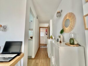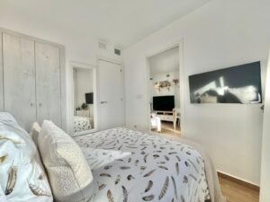 We present this beautiful apartment located on the seventh floor, offering panoramic views and a partial sea view. Just a 20-minute walk from Playa de los Locos and close to all amenities, it's perfect as a permanent residence or a holiday home. The property features 2 bedrooms, a full bathroom and an en-suite toilet, and has been fully renovated in 2022 with high-quality materials and stylish, modern design. Highlights include: Double-glazed Climalit tilt-and-turn windows Wood-effect porcelain flooring Smooth walls Central air conditioning Security door The apartment is sold unfurnished. Furniture is not included. The complex boasts spacious and well-maintained green areas and offers two communal swimming pools to enjoy the Mediterranean climate. There is also the option to rent a communal parking space for €500 per year. With a fantastic southeast orientation, this apartment is bright and comfortable all year round.