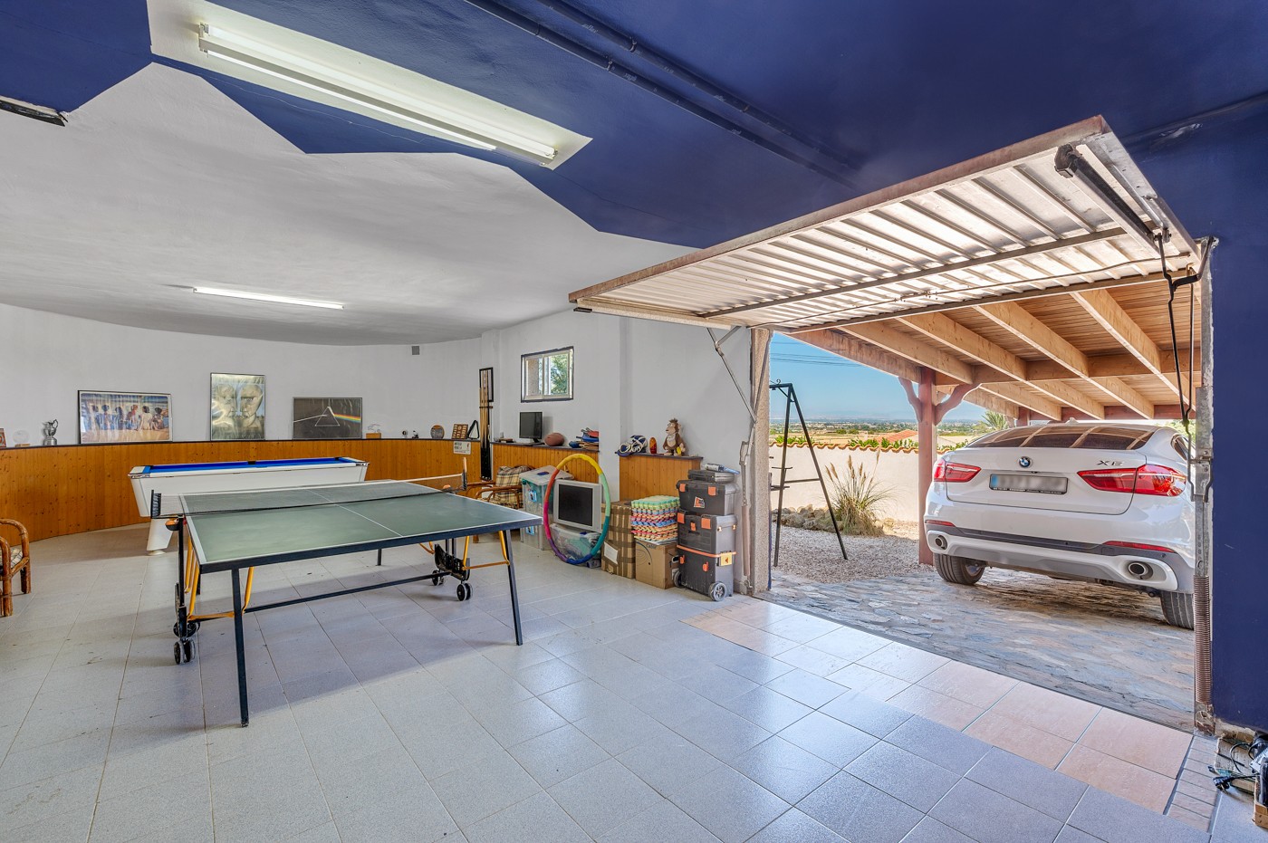 Offering the perfect spot to relax and enjoy yourself after dinner, the garage has been converted into a fun playroom, while a stylish wooden carport comfortably accommodates two cars.