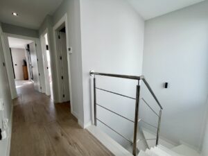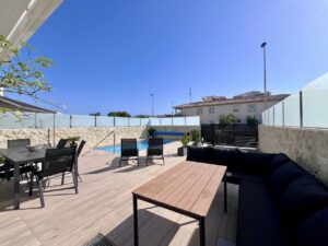 Experience modern coastal living at its finest in this exceptional resale new-build villa, perfectly positioned in the heart of Punta Prima. This home offers the ultimate blend of style, comfort, and convenience—just a short walk from the beach, restaurants, shops, and all local amenities.This high-spec, fully furnished residence spans multiple levels and has been designed with contemporary elegance and functionality in mind. The property features four bedrooms, with one conveniently located on the ground floor and three on the first floor, along with a fully finished basement offering an additional bedroom and bathroom—ideal for guests or extended family. Air conditioning is installed throughout with a ducted system to ensure year-round comfort, while the upgraded electrical panel and state-of-the-art security system provide safety and peace of mind.Every detail has been considered for modern living. A comprehensive water filtration system delivers clean, high-quality water throughout the home, while the solar swimming pool cover improves energy efficiency and helps maintain optimal pool temperatures. An automatic self-closing awning offers convenient shade and protection during sunny days.The rooftop terrace has been thoughtfully upgraded to create a private sanctuary, featuring premium artificial grass and a custom putting green—the perfect spot for relaxing, entertaining, or simply enjoying the coastal views.Set in a central and highly sought-after location, this villa allows you to embrace the best of coastal living with everything just steps away. Combining modern architecture, smart technology, and luxurious finishes, this move-in-ready home is ideal as a permanent residence, a holiday retreat, or a high-end investment opportunity in one of the Costa Blanca’s most desirable areas.