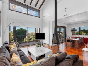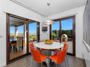 This very special property has an extraordinary location by the green on hole 10. The property is elevated on a hill with an extraordinary and unobstructed view and over the entire resort. In front of you you have the golf course, the spa hotel and the clubhouse. The property is also the only one with its own access directly to the golf course. Here you can drive your buggy out from your own garage.