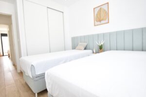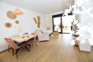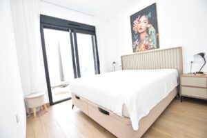 Modern apartment in Residencial Nalia with 2 bedrooms, 2 bathrooms (1 en-suite), open-plan living, and 57 m² of private terraces. South-facing terrace with pool views + north-facing terrace with Pink Lagoon views. Communal pools, gym, optional underground parking/storage. Close to amenities, golf, beaches, and Alicante Airport.hops, restaurants, golf, and beaches. Ideal for holidays or year-round living.