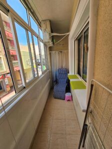 A one-bedroom apartment with a glazed balcony is for sale on Orihuela Street, 60 — right in the heart of Torrevieja. The vibrant city center, everything is nearby: supermarkets, bus stops, a school, the town hall, and the marina. Distance to the sea and beach — only 550 meters in a straight line. The apartment is located on the 2nd floor of a building constructed in 1995, with an elevator and intercom. The windows face southwest, making the apartment bright and dry. Total area — 47 m². Includes an entrance hall, living room with balcony, American-style kitchen, bedroom, and a full bathroom. Sold furnished and with household appliances. Move-in ready.