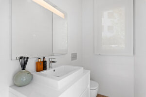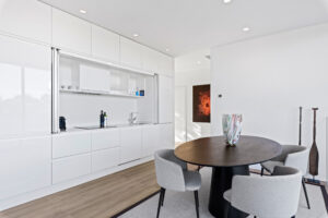 On the main floor, you’ll find a spacious master suite with ensuite bathroom, a guest toilet, and an open-plan living and dining area with a designer kitchen. Large windows seamlessly connect the interior to the expansive pool terrace, where multiple seating areas and a heated swimming pool invite you to enjoy the Mediterranean lifestyle year-round.