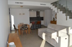 Semi-detached detached duplex villa, Las Higuericas For sale this fantastic property located in Torre de la Horadada, just 150 m from the beach: Las Higuericas, surrounded by parks and low buildings. It has a well-kept garden with a 6x3m heated saltwater pool. The constructed area is 108m2 and consists of 3 bedrooms, a living room with the open plan kitchen and two functional bathrooms. There are also two terraces: a large one with a fixed pergola and a solarium with beautiful sea views. The property is sold semi-furnished. Las Higuericas Beach is one of the most emblematic beaches in Torre de la Horadada, in the municipality of Pilar de la Horadada, Alicante. With a length of 966 meters and a width of 35 meters, this golden sandy beach is highly appreciated by both local residents and visitors to the Region of Murcia.