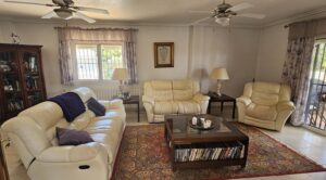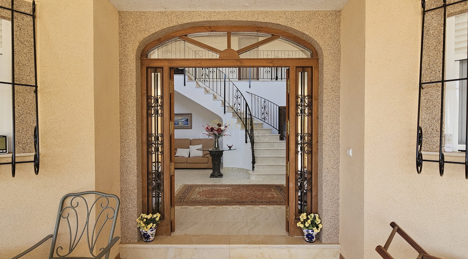 This stunning property is ideal for those who appreciate open views, nature walks, and the tranquility of the outdoors. Situated in Pinar de Campoverde, the house offers all the high-end features you'd expect, including a private pool, air conditioning, and oil central heating.Main FloorAs you enter, you are greeted by a spacious hall with stairs leading to the first floor, along with a guest toilet and a small storage room. To the right, there is a large living room with access to a covered terrace. On the left, the hall leads to a dining room, also with terrace access, a small office, and a large kitchen featuring an island and top-quality appliances. Adjacent to the kitchen is a utility room with a separate entrance from the rear of the house. The kitchen also connects to a hallway that leads to the basement and sleeping quarters.From the entrance hall, a separate door leads to a corridor with access to two bedrooms, each with fitted wardrobes, a shared bathroom, and stairs leading down to the basement/garage.Basement/GarageDescending the stairs from the hallway, you'll find two additional bedrooms with fitted wardrobes, another bathroom, and the garage, which has space for two vehicles. The garage also houses two rooms for the oil central heating boilers.First FloorThe master bedroom is located on the first floor, with access to a large terrace offering spectacular open views—ideal for sunbathing or relaxing. The bedroom also includes a spacious dressing room and a luxurious bathroom, complete with a shower and jacuzzi tub.DetailsIBI (SUMA): €1,580/year (house) + €25/year (car entrance).Area InformationPinar de Campoverde, located 160 meters above sea level, is a thriving community within the municipality of Pilar de la Horadada, which has around 23,000 residents. The area boasts well-established infrastructure with numerous bars, restaurants, a medical center, and a police station. It also features beautiful natural parks, such as the famous Seco riverbed, a scenic walk of 1-2 hours leading to Mil Palmeras, where you can enjoy a refreshing swim in the Mediterranean Sea.The Lo Romero Golf Course is just a couple of kilometers away, and there are around 30 more golf courses within a 45-minute drive. Torre de la Horadada, known for its 10 Blue Flag beaches, is only 10-12 km away. If you prefer public transportation, regular bus services are available.This area is perfect for outdoor enthusiasts, offering scenic hiking trails, tennis courts, and proximity to golf courses.