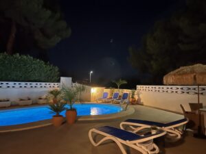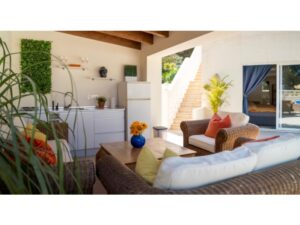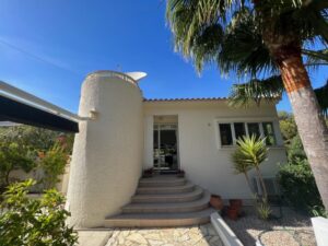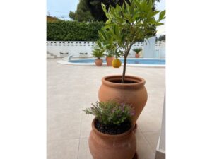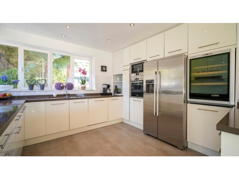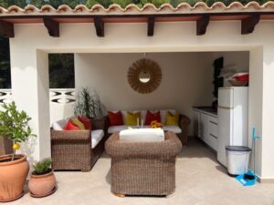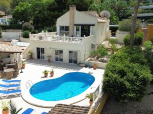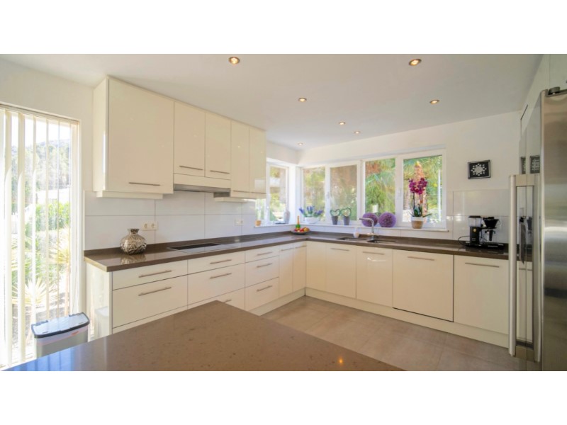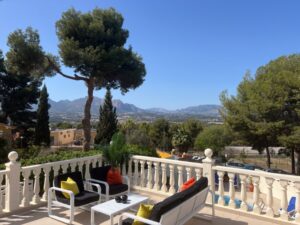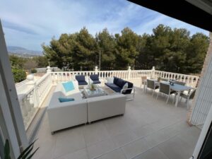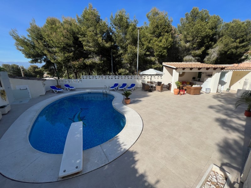 Fantastic villa located high up on the hill in Albir. The view is fantastic where you can see the mountains around Albir from Benidorm in the south to Calpe in the north. The villa is located in a quiet and attractive area of Albir, with close proximity to the world-famous luxury/spa hotel called SHA. It is also a short way down to the beach.The home itself is located on an unobtrusive corner plot with an exquisite view. With a total size of 208 square metres, you have plenty of space for the whole family. The plot contains a private pool, outdoor kitchen, garden with fruit trees and several zones for enjoying the sun.The home is over two floors and contains four bedrooms (one en-suite) and two modern bathrooms with the option of furnishing with an extra bathroom and bedroom if desired.When you enter the home, you see a high ceiling and a great fireplace that stretches all the way up to the ridge. Get a bit of a feel of and enter a Caribbean house. The kitchen is new and modern and contains everything you need for a comfortable lifestyle, including induction hob, water purification, wine cabinet, double fridge etc.On the same floor you will find a guest toilet and a spacious living room with access to a large terrace with a lovely view.The outdoor areas are the real highlight with a swimming pool with diving board, terraces with a view, an outdoor kitchen under a roof, a toilet and large stalls.Here you can enjoy gatherings and meals because of the beautiful outdoor kitchen.The home is planted so that you get many beautiful separated zones on the property.The home is sold fully furnished, so you can move right in. ref:VIL_3