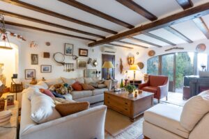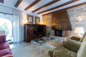 Inside, the residence opens with a cozy living room, equipped with a fireplace and access to a charming terrace overlooking the front garden, as well as an internal courtyard ideal for windy days.
