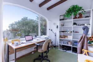 Heading out to the terrace from the dining room, you can enjoy stunning views of the backyard garden from a small outdoor dining area, next to an office with panoramic views that inspire creativity and productivity.