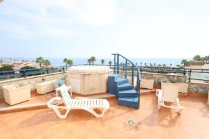 Located in one of the most exclusive areas of Mil Palmeras, this fantastic 119 m² duplex penthouse is situated in the prestigious Río Mar XI residential complex. The property is distributed over two floors and offers:. . 3 bedrooms (two on the main floor and one on the upper floor). . 2 full bathrooms and 1 guest toilet. . A fully equipped independent kitchen. . Bright living-dining room with access to a spacious terrace boasting views of the sea, the gardens, and the communal pool. . A spectacular private solarium with jacuzzi, ideal for enjoying the Mediterranean climate and moments of relaxation. . The property is sold furnished and equipped with air conditioning. It also includes two parking spaces.. . The residential complex offers extensive green areas, a communal swimming pool, a tennis court, a children’s playground, and a football pitch.. . A perfect home both for year-round living and for enjoying unforgettable holidays.