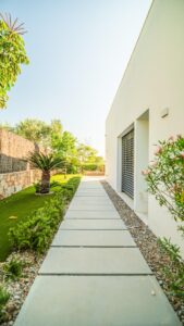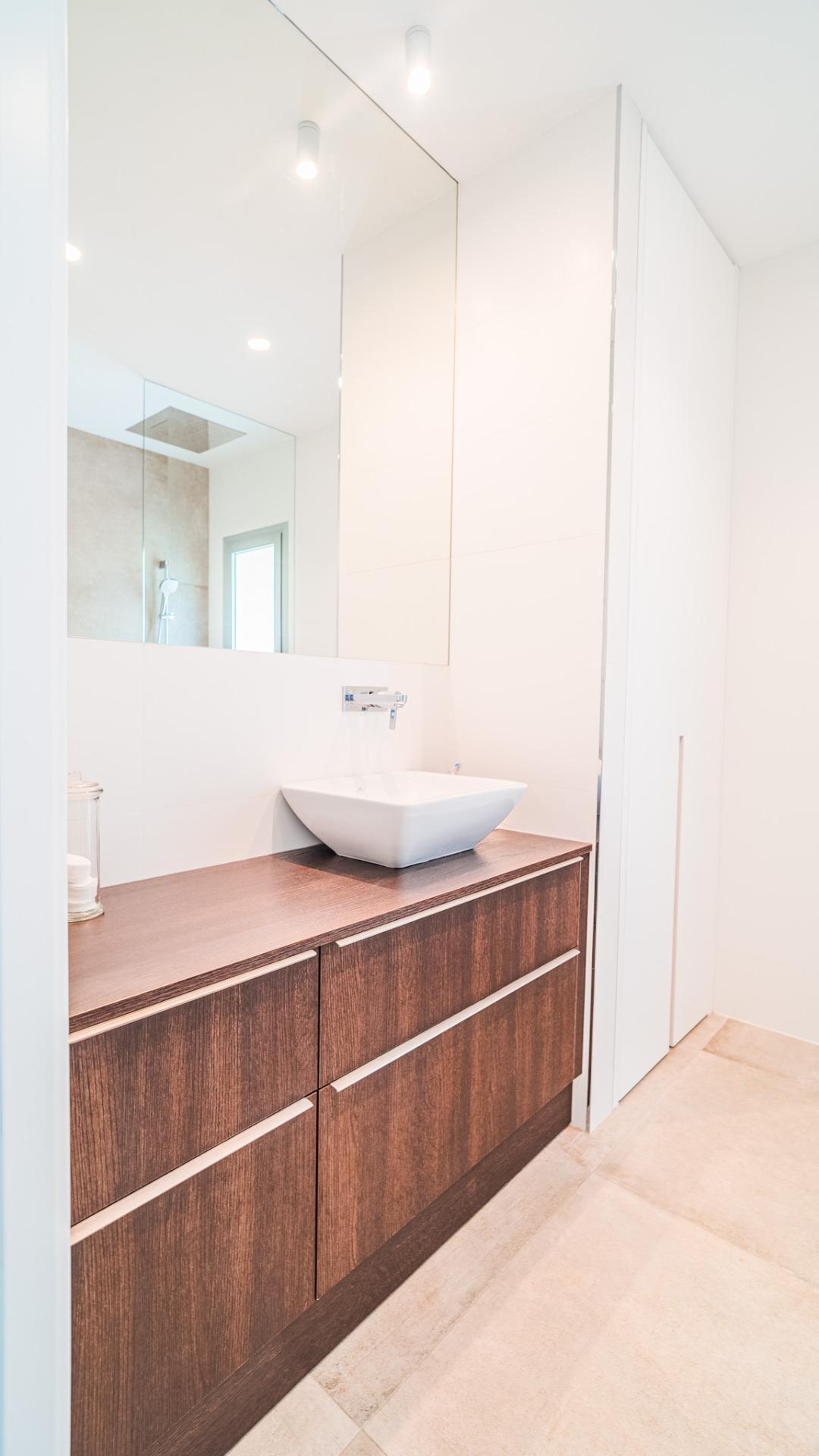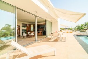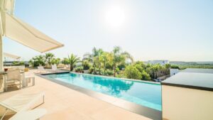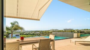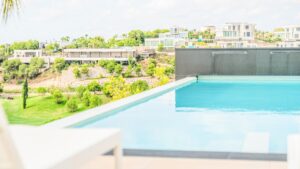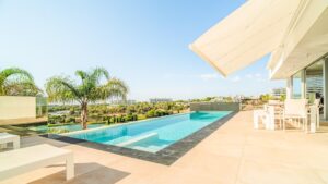Jedna z najbardziej wyjątkowych nieruchomości w Las Colinas Resort — ta willa oferuje przepiękne widoki na pole golfowe, jezioro oraz morze na horyzoncie. Willa posiada basen typu infinity oraz duży taras, na który można wejść z salonu oraz trzech sypialni. Na dolnym poziomie znajduje się przestronne pomieszczenie obecnie wykorzystywane jako dodatkowy salon z częściowo wydzieloną strefą sypialnianą. Na tym poziomie znajduje się również łazienka. Na działce jest miejsce do parkowania, a dodatkowo istnieje możliwość zaadaptowania części dolnej kondygnacji na garaż. Oprócz widoków, willę wyróżnia ponadczasowy, nowoczesny design, który nadaje jej wyjątkowy charakter — taki, jakiego brakuje wielu innym willom nawet w podobnym przedziale cenowym. Dwukolorowa kuchnia, designerskie rolety, elegancki hol wejściowy, ciemne płytki wokół basenu oraz przyciemniane panele szklane na tarasach podnoszą standard nieruchomości, nie zaburzając jednocześnie harmonii z otoczeniem ani funkcjonalności. Prywatność to kolejny aspekt szczególnie ważny przy nieruchomościach tego kalibru — i również tutaj willa spełnia oczekiwania. Dzięki położeniu na końcu ślepej uliczki, przyciemnianym panelom tarasowym oraz orientacji działki możesz cieszyć się panoramicznym widokiem na pole golfowe, podczas gdy nieliczni przechodnie zobaczą jedynie fragmenty fasady.
