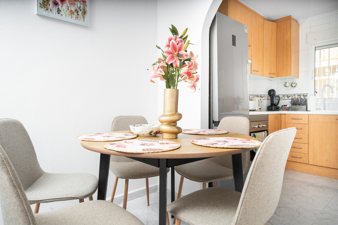 Immerse yourself in the charm of Mediterranean living with this beautifully renovated townhouse nestled in a serene community in Orihuela, Alicante. From the sun-kissed exterior to the sophisticated interior, every inch of this home is designed to delight and inspire.Boasting a generous 124 square meters of living space, this residence features four bedrooms, including a spacious primary bedroom that serves as a peaceful retreat after a long day. The home also includes two full bathrooms and a convenient half-bath, making morning routines as smooth as your Spanish espresso.The heart of this home is undoubtedly its cozy, well-appointed kitchen, where you can whip up delectable meals with ease. Flowing effortlessly from the kitchen is the living area, a perfect space for relaxing with family or entertaining friends, all while enjoying views of the community.Step outside, and you’ll find yourself in a tranquil urbanization that boasts a communal pool—ideal for cooling off on those sizzling summer days or lounging with a good book. The private garage ensures your vehicle is kept safe and sound, possibly dreaming of road trips along the stunning Costa Blanca.For those who venture outside, convenience is just a stone’s throw away. Satiate your appetite at La Luna Restaurante Bar located merely steps from your front door, or fulfill your shopping needs at nearby supermarkets like Aldi and Supermercado Consum. Families will appreciate the close proximity to IES Playa Flamenca, ensuring a short commute for the young scholars.This townhouse is a sun worshipper’s paradise, bathed in natural light throughout the day, thanks to its thoughtful orientation. Whether you're basking in the morning rays with a cup of coffee or enjoying the last light of day from your private terrace, this home ensures you experience every bit of sunshine.This property isn’t just a house, it’s a lifestyle—a sanctuary where every day feels like a vacation. Whether you’re dipping in the pool, exploring local cuisine, or simply relaxing in your elegantly designed living space, this townhouse offers a blend of comfort, convenience, and luxury that makes it not just a smart investment, but a place to call home. Don’t miss your chance to own this little slice of heaven in Alicante!