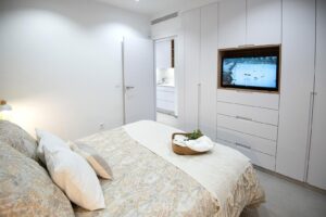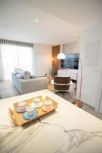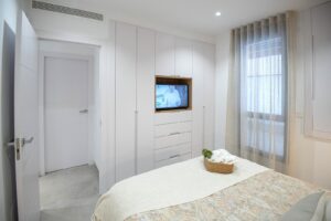 Apartments and penthouses with 2 and 3 bedrooms, 2 bathrooms, with open plan fully equipped kitchen with white goods - Bosch or Siemens, living area, large terraces, fitted wardrobes, fully equipped bathrooms with underfloor heating, aircon, electric shutters, closed storage, parking space with socket 16 Amp for electric cars.