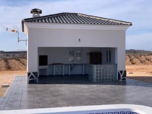 All houses include 2m stamped concrete terrace around the pool (colour and pattern to choose), 1m around the house, gated entrance, 3.000 m2 fencing, pre-installed ducted aircon, standard kitchen, security door, german tilt and turn windows (or sliding if prefered), built-in fireplace and chimney, pre-installation for tv and internet, gravel driveway plus a few meters around the house, septic tank.