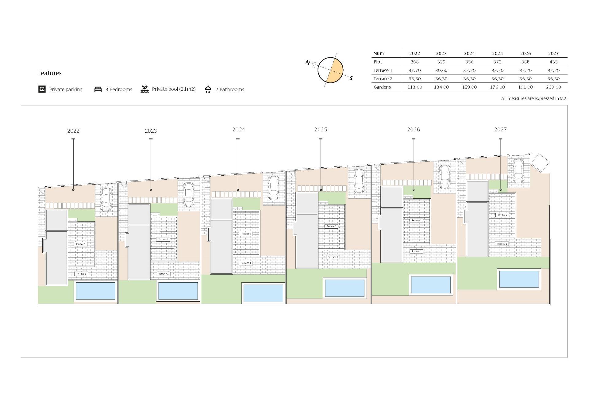 Villas build over 2 floors, has 3 bedrooms, 2 bathrooms, open plan kitchen with living area, where are large windows with direct access to the terrace and the pool.