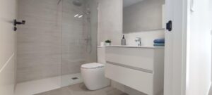 Fully fitted bathrooms with toilet, vanity unit, mirror and shower with screen panels.
