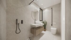 The ground floor offers an open-plan living-dining room with integrated kitchen and central island, creating a bright and elegant space for everyday living. From the living room, large sliding doors give direct access to the garden, swimming pool and private parking area. This floor also includes a bedroom with en-suite bathroom and dressing room, a guest toilet and a laundry room.