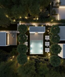 The residential is arranged over two levels to adapt naturally to the terrain. The upper level is dedicated entirely to the homes and landscaped communal areas, creating a safe and quiet pedestrian environment. The lower level houses parking spaces, storage rooms and technical areas, discreetly integrated into the design. This separation ensures privacy, tranquillity and a car free living experience within the residential area.Modern Villas with Private Gardens