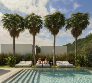 Residents can enjoy a beautifully designed communal swimming pool with solarium, surrounded by landscaped gardens that create a calm and inviting atmosphere. The homes include a fully equipped kitchen in white matte finish with black worktop, air conditioning by split units, aerothermal system for hot water, reinforced security entrance door and bathrooms with fitted furniture and shower screens. An elevator connects the parking level with the residential area for added convenience.Key Distances