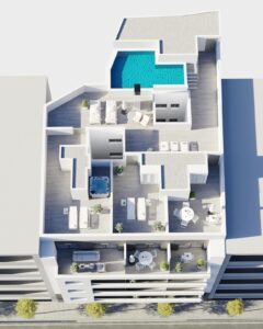The apartments are built with high quality materials and a strong focus on energy efficiency. Exterior aluminum carpentry includes thermal break technology and double glazing for thermal and acoustic insulation. Motorized shutters add comfort and security. Each home has pre installation for ducted air conditioning and heating, reinforced entrance doors and white lacquered interior doors. Hot water is produced through an aerothermal system, reducing energy consumption and improving sustainability.Rooftop Solarium with Communal Pool