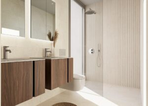 These modern villas are distributed over two floors and offer a choice of 2 or 3 bedrooms and 2 bathrooms. Each home features an open plan kitchen and living area designed to maximize natural light and comfort. The first floor includes open terraces ideal for enjoying the mild climate, while the ground floor opens onto a private garden with swimming pool. Parking is available within each private plot.The interiors are elegant and functional, making these homes ideal for permanent living, holiday use or investment. Bedrooms are fitted with built in wardrobes with drawers, and bathrooms are delivered fully equipped with furniture with mirror and shower screens.